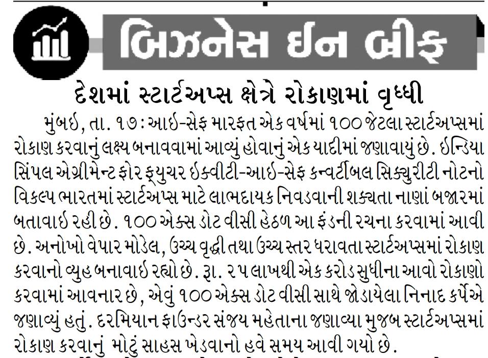 Gujarat Samachar: "100X.VC, Fund launched, aims to invest in 100 startups via iSAFE in a year, first time in India"